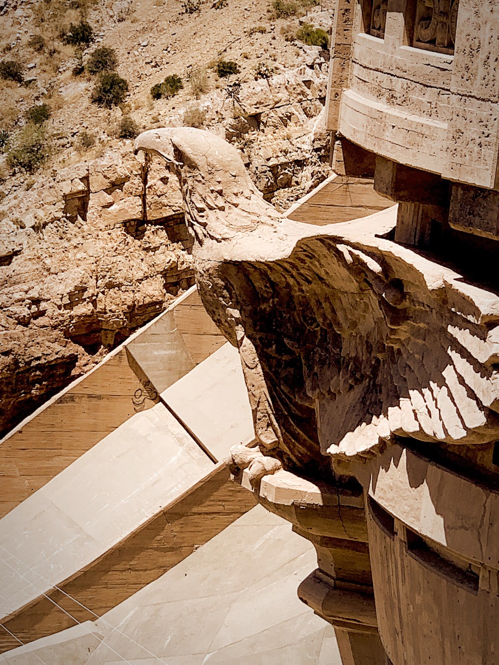 I have driven over this dam several times, and never knew these spectacular eagles were even there! They are only visible if you walk across the dam and lean over the edge to look down at the water coming out on the other side.