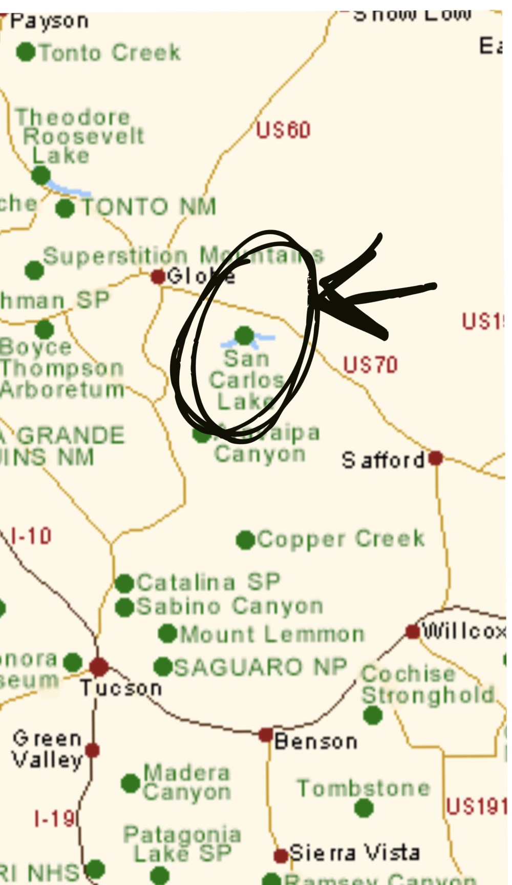 San Carlos lake is located on the San Carlos Indian Reservation just East of Globe, AZ.